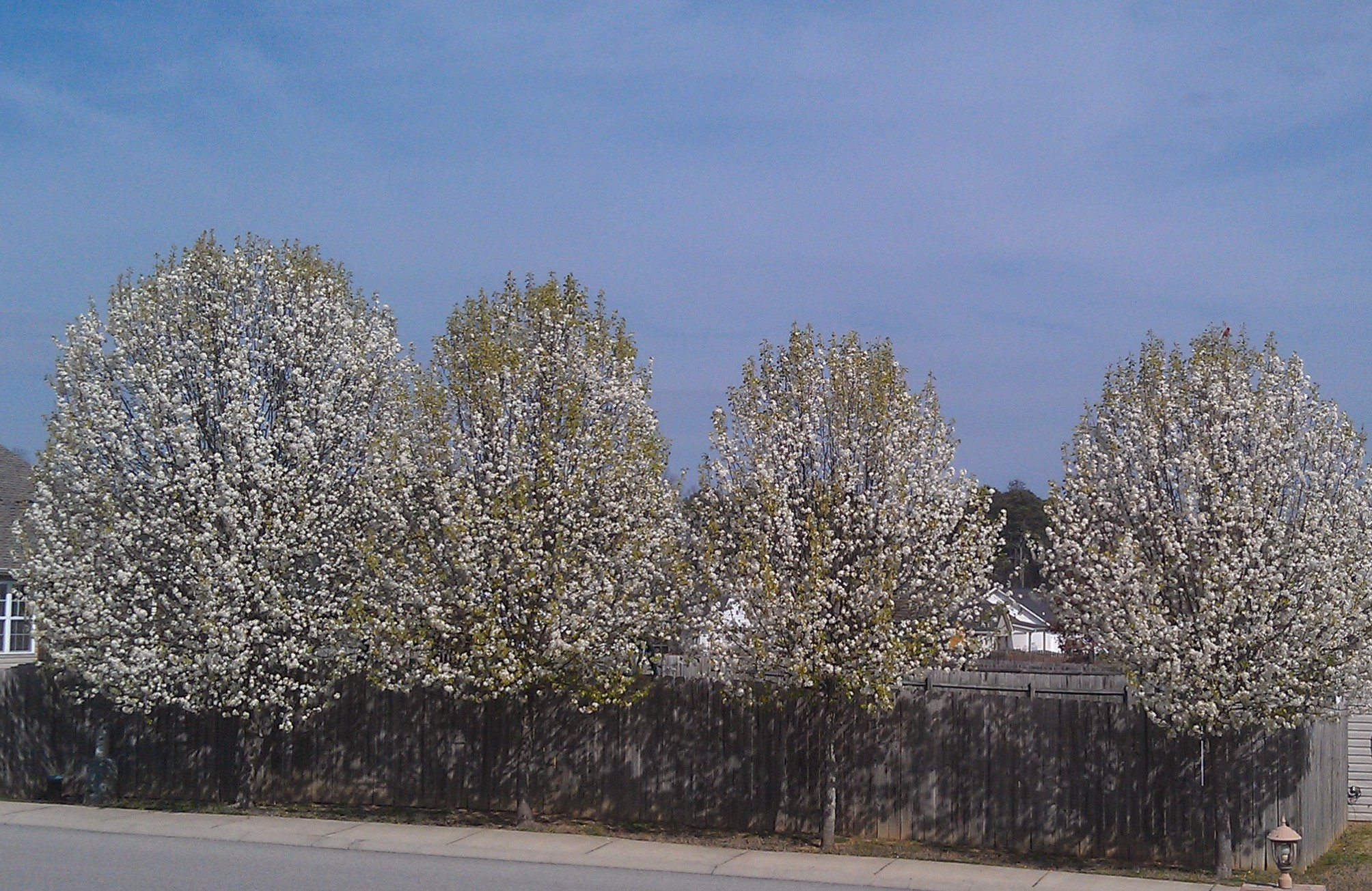 Today the Bradford Pear Trees are in full bloom; already their petals are flying across the airwaves from yard to yard.  The other day my throat closed up on me in the middle of a conversation with my new neighbors.  I walked down with a bag of chocolate chip muffins, just out of the oven.  So warm, the plastic bag was steamed over.  The teenage son, twin ten-year-old boys, and 8 year-old daughter gobbled them up while their parents and grandmother and I exchanged names and telephone numbers.  I was there only a few minutes so as not to disturb their unpacking, but by the time I walked back to my house two doors down, I could not stop coughing or catch my breath.  I thought at first I was choking and then it came to me that it was the blossoms of the pear trees across the street from my house.